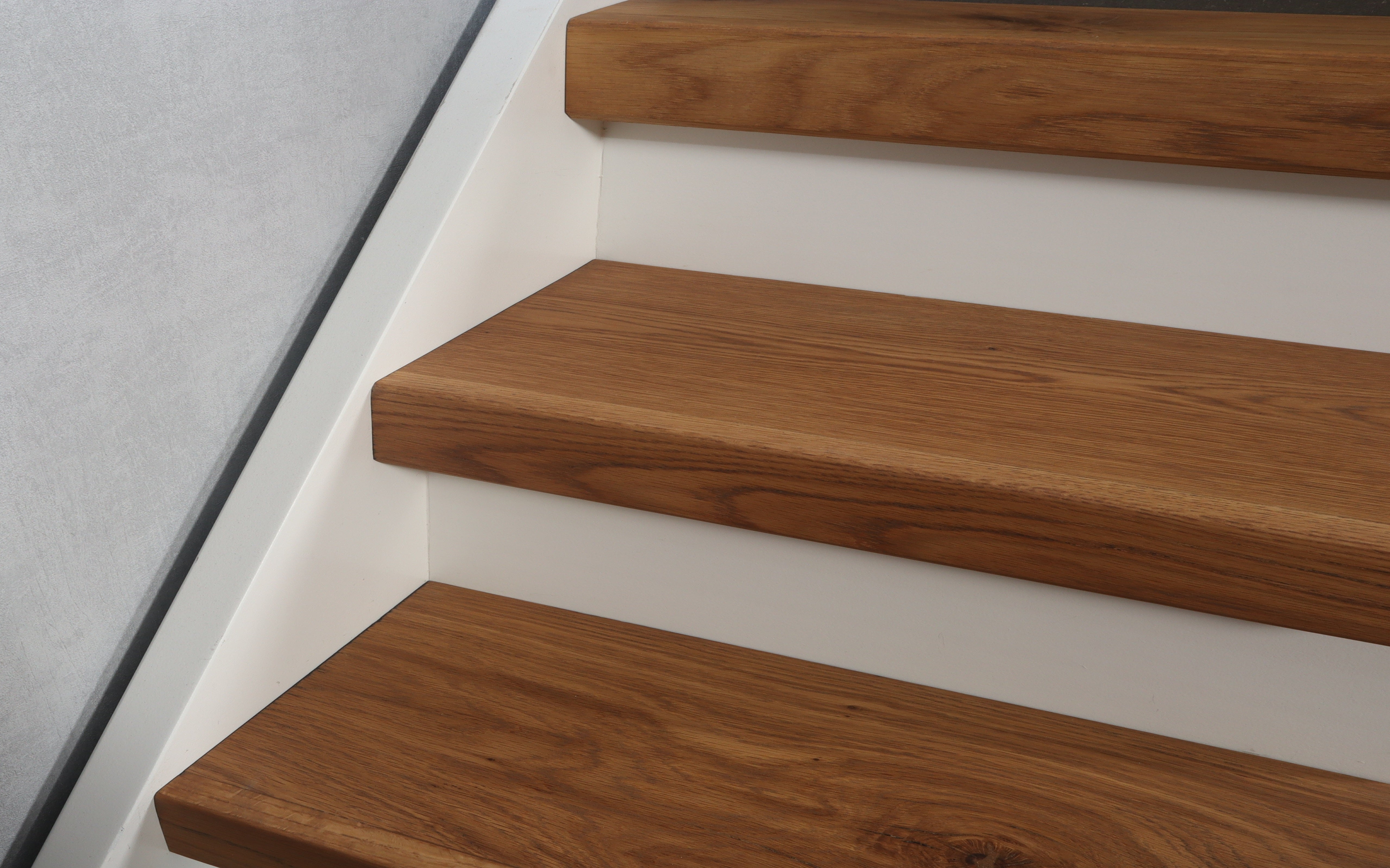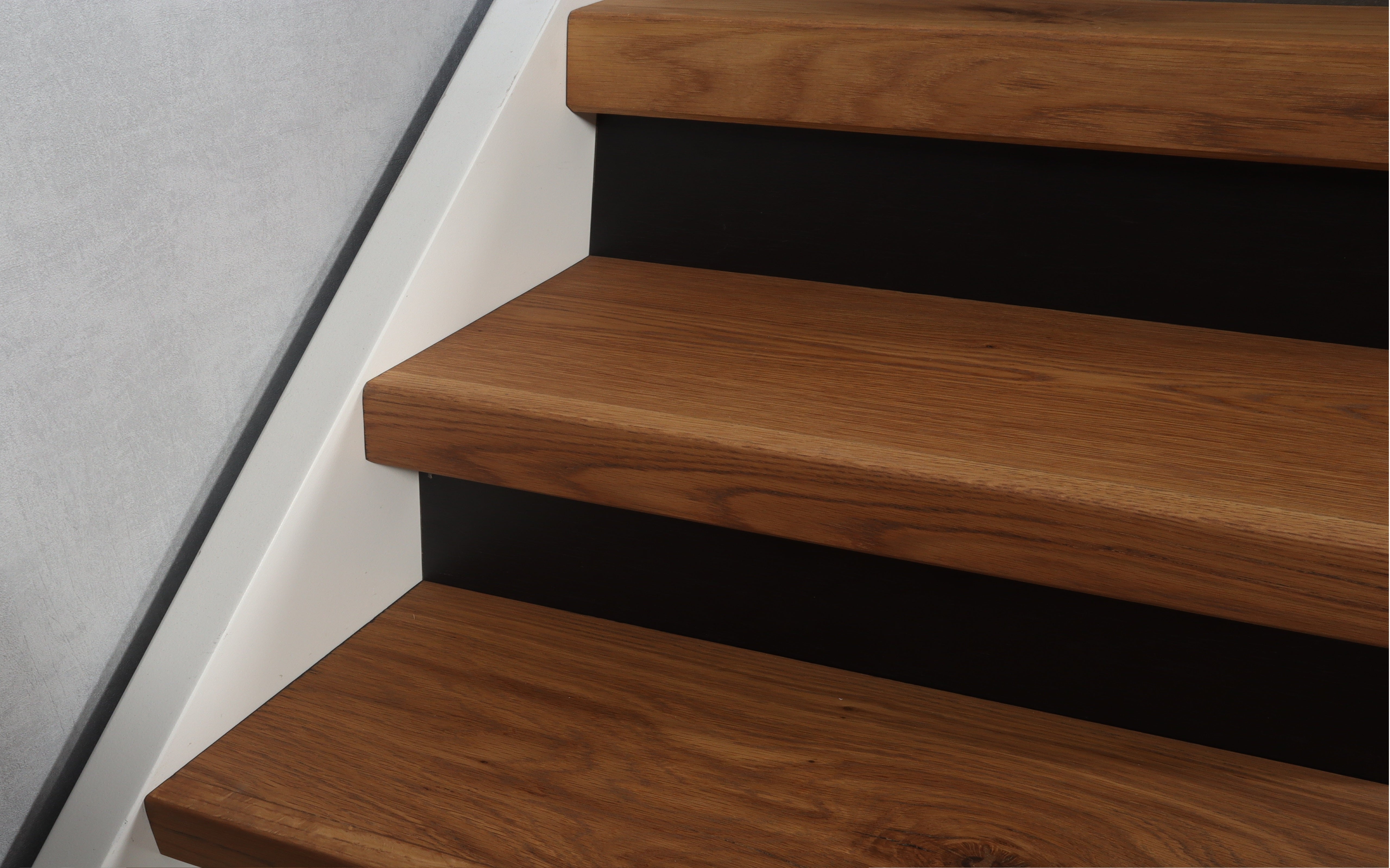 Eiken traprenovatie set met kant-en-klaar op kleur gemaakte eiken overzettreden, uitlooptrede en stootborden.